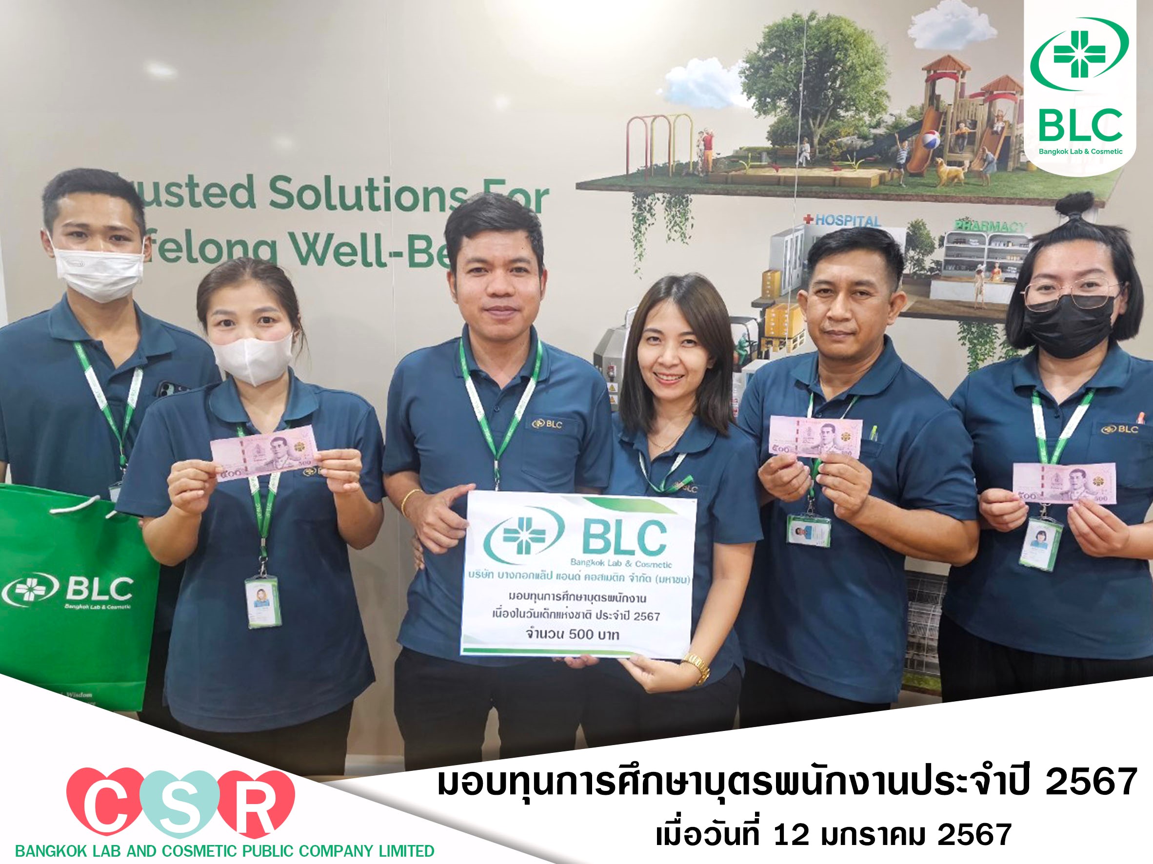 เมื่อวันที่ 12 มกราคม 2567 บริษัท บางกอกแล็ป แอนด์ คอสเมติค จำกัด (มหาชน) ได้จัดพิธีมอบทุนการศึกษาให้แก่บุตรพนักงาน ประจำปี 2567 โดยคุณวงศธร งามเอนกผู้อำนวยการสายงานสนับสนุนและคุณสมพร ผ่องศิริ ผู้จัดการส่วนการจัดการทั่วไป เป็นผู้มอบทุนการศึกษาให้แก่บุตรของพนักงาน จำนวน 40 ทุน และรางวัลปลอบใจอีก 24 ทุน