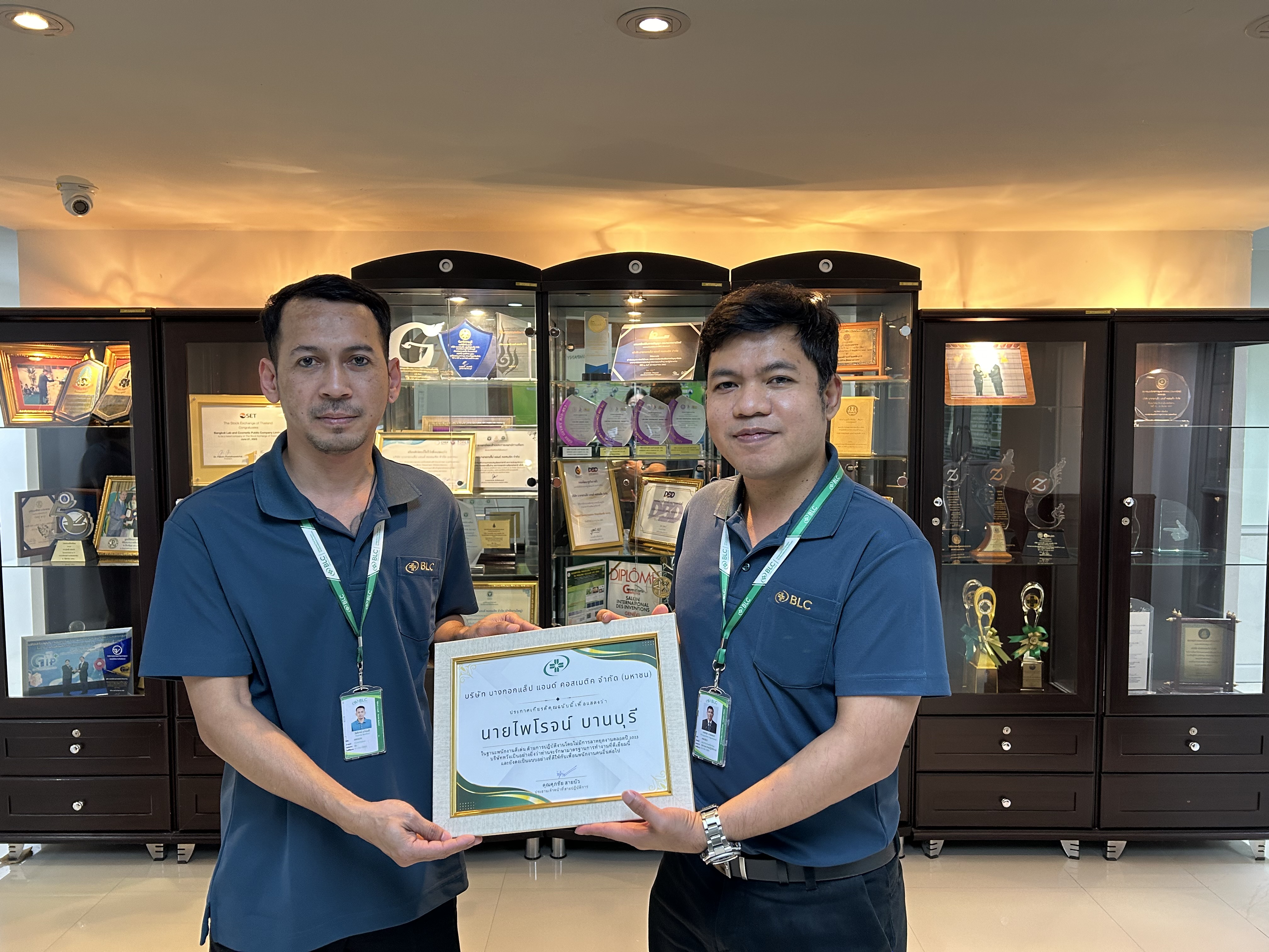 บริษัท บางกอกแล็ป แอนด์ คอสเมติค จำกัด (มหาชน) ได้มอบใบประกาศเกียรติคุณให้กับ คุณไพโรจน์ บานบุรี สังกัดหน่วยงานแผนกชั่ง ฝ่ายคลังวัสดุ ส่วนจัดหาและสำรอง ในฐานะพนักงานดีเด่น ด้านการปฏิบัติงานโดยไม่มีการลาหยุดงานตลอดปี 2023 โดยบริษัทหวังเป็นอย่างยิ่งว่าท่านจะรักษามาตรฐานการทำงานที่ดีเยี่ยมนี้และยังคงเป็นแบบอย่างที่ดีให้กับเพื่อนพนักงานคนอื่นต่อไป